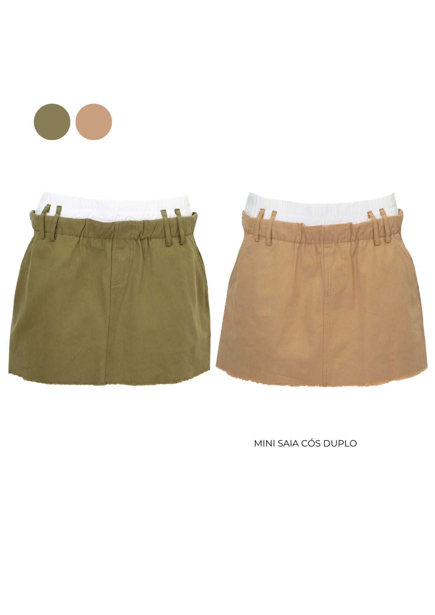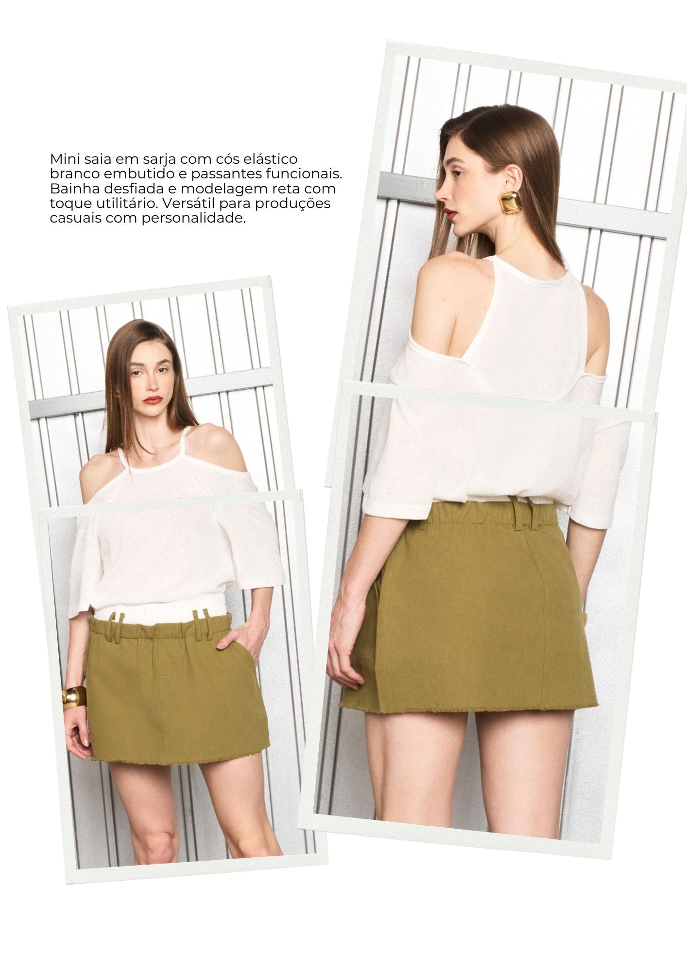 Mini saia em sarja com cós elástico branco embutido e passantes funcionais. Bainha desfiada e modelagem reta com toque utilitário. Versátil para produções casuais com personalidade.