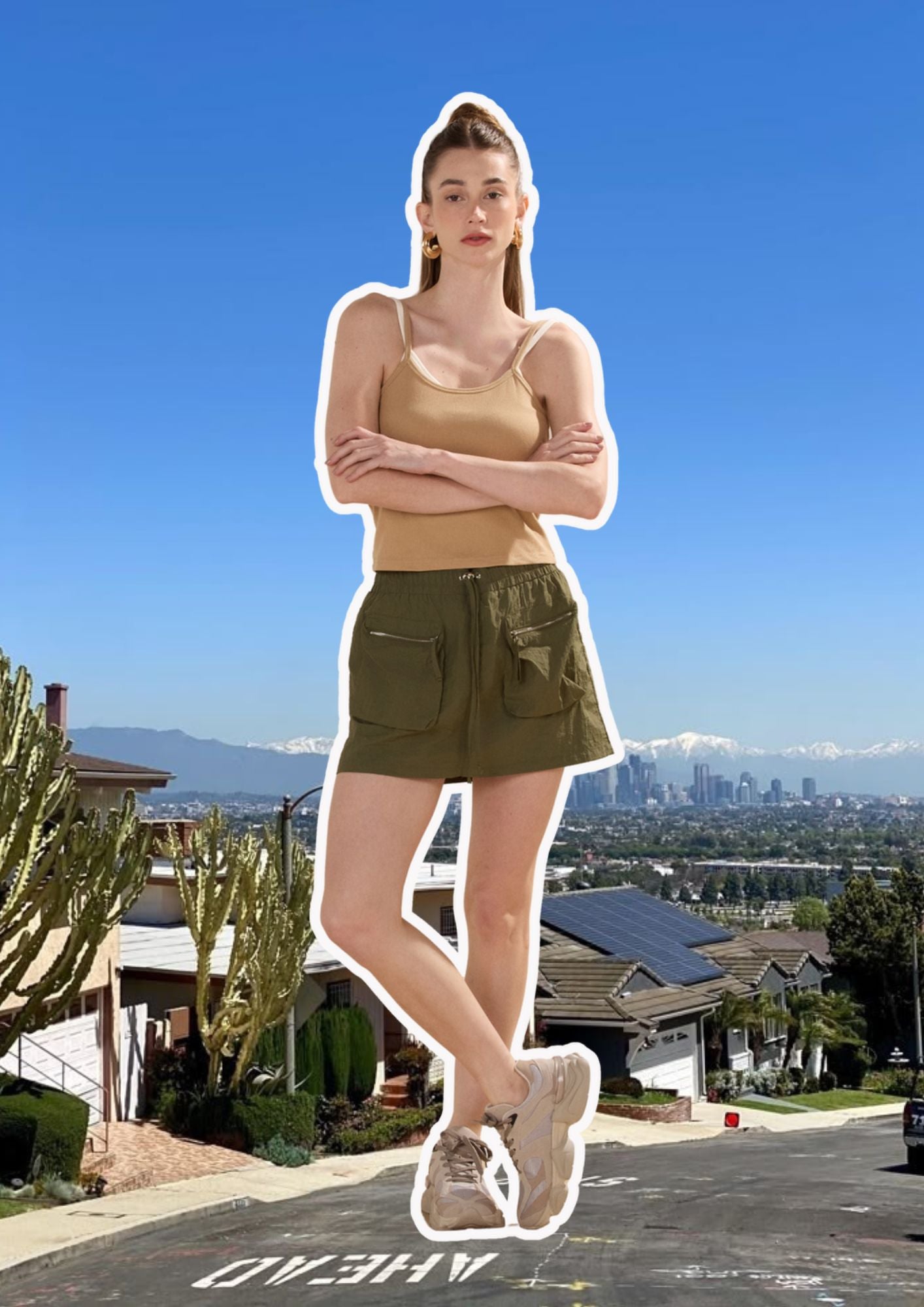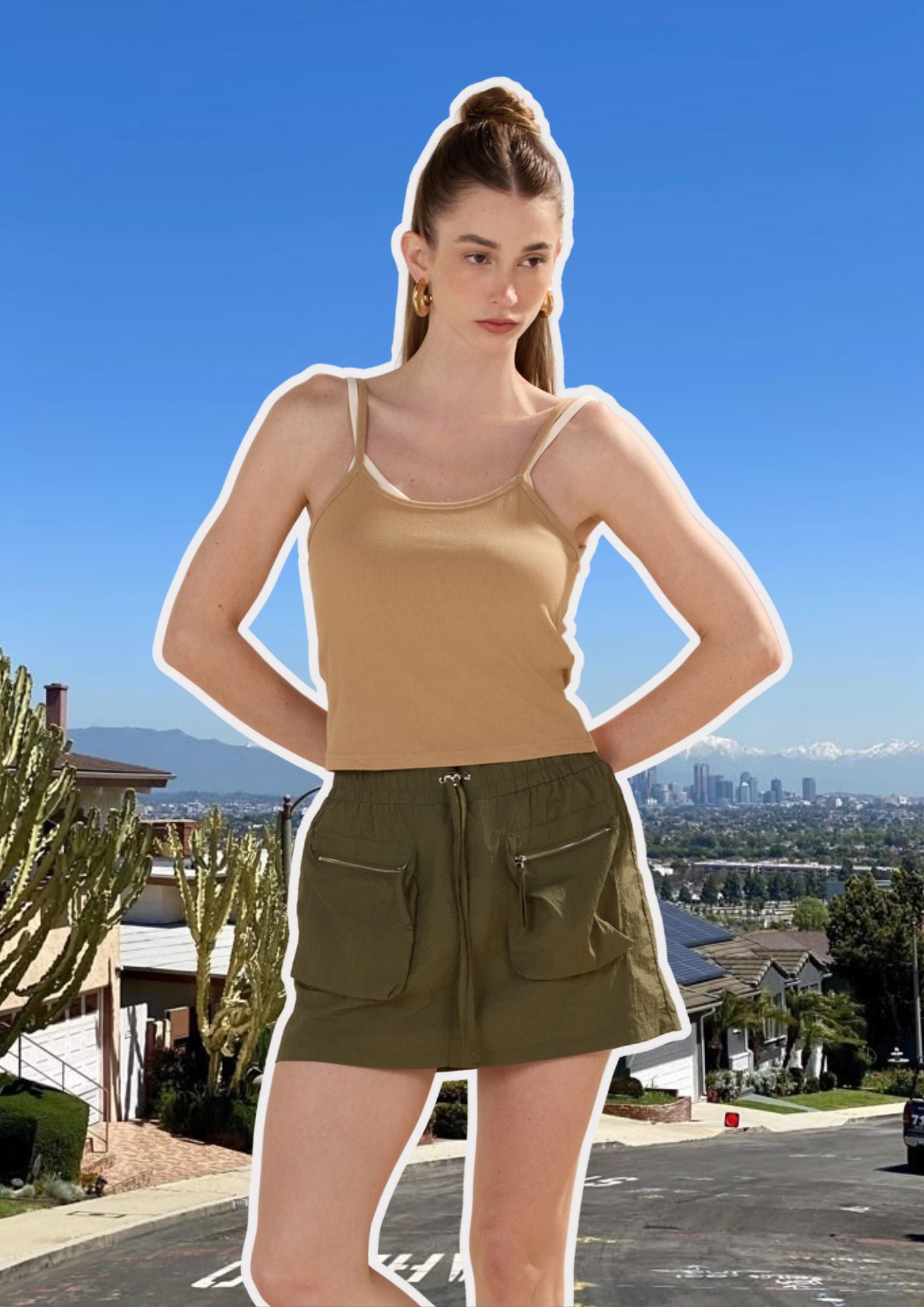 Saia curta em tecido empapelado com textura leve e toque levemente amassado. Possui cós com elástico e ajuste por cordão embutido, bolsos frontais com zíper metálico e lapelas utilitárias. Modelagem reta e funcional.