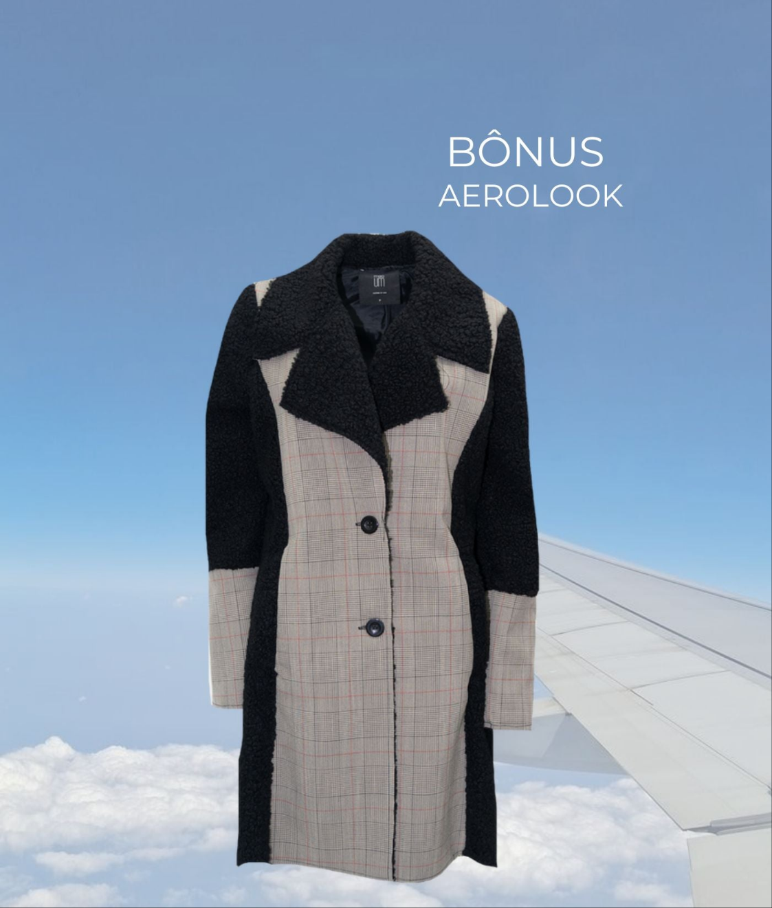 Casaco longo com recortes contrastantes, gola ampla e botões frontais. Combinação de xadrez e tecido peluciado para visual marcante.