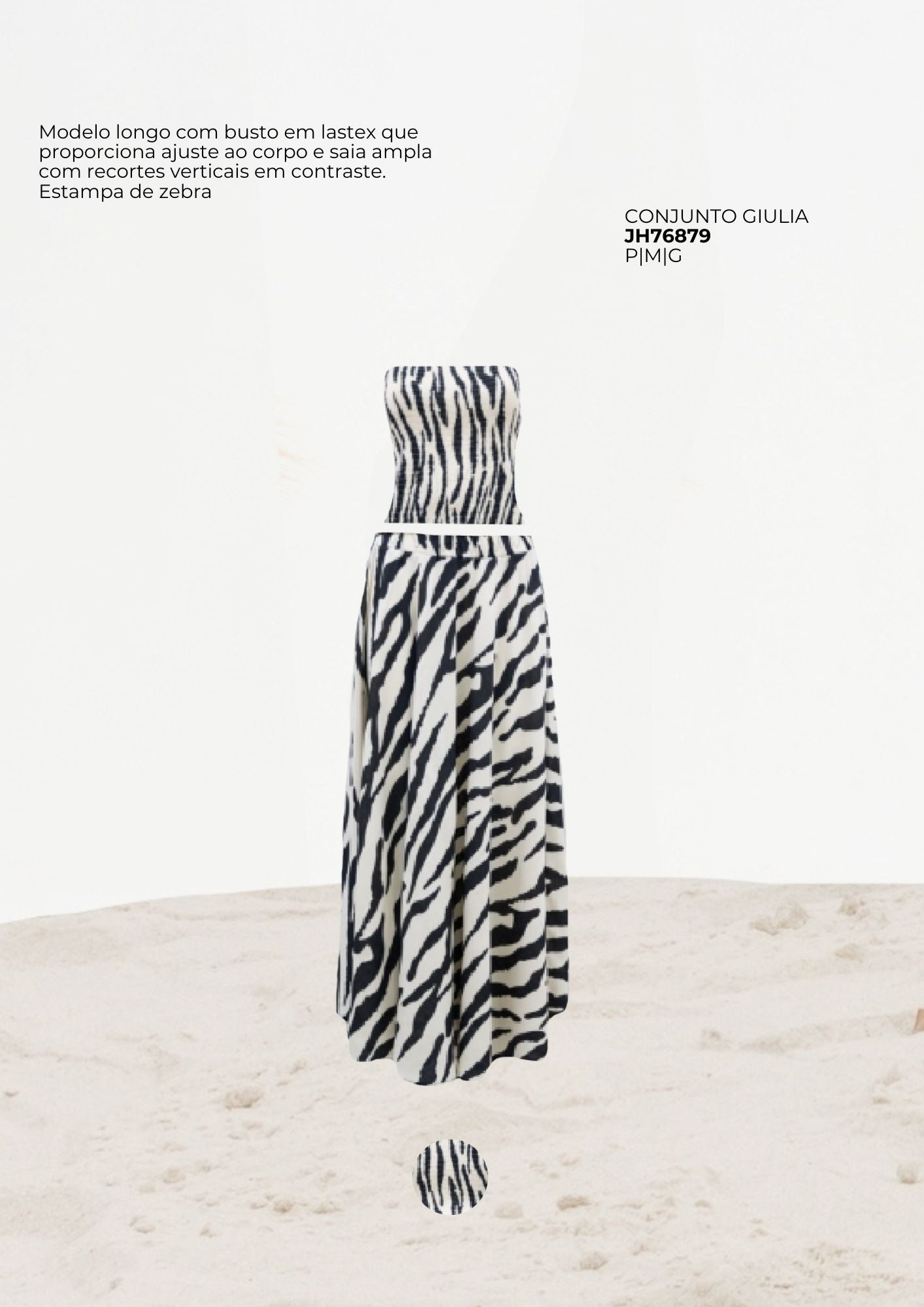 Modelo longo com busto em lastex que proporciona ajuste ao corpo e saia ampla com recortes verticais em contraste. Estampa de zebra
