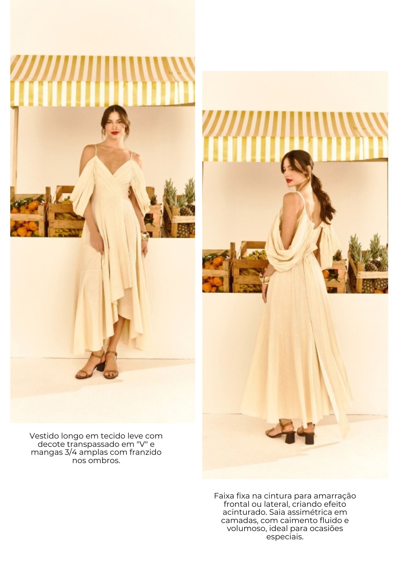 Vestido longo em tecido leve com decote transpassado em "V" e mangas 3/4 amplas com franzido nos ombros.