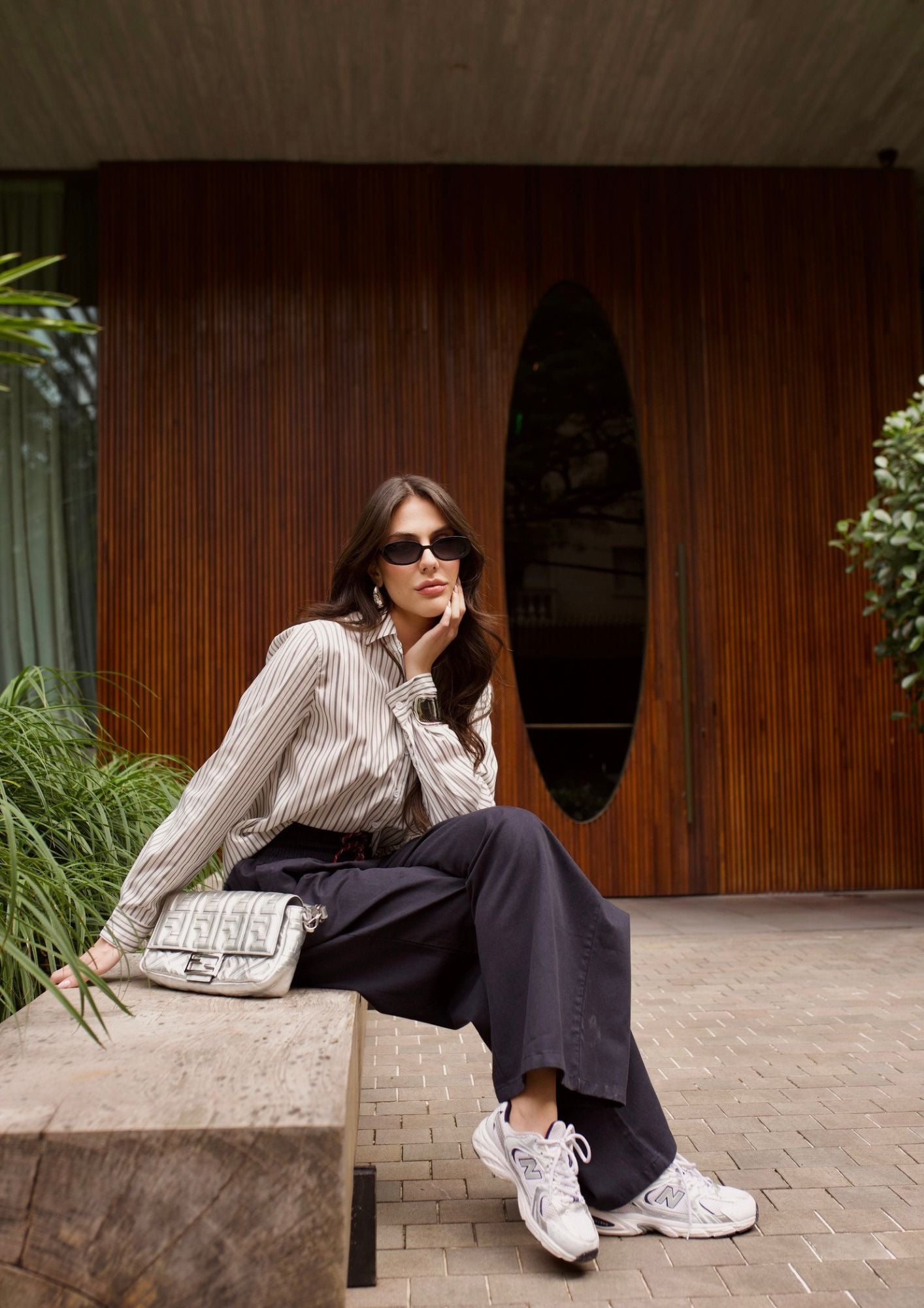Peça de modelagem evasê com caimento fluido, confeccionada em tecido leve. A estampa listrada diagonal proporciona efeito visual alongador e moderno. Possui cós reto e fechamento lateral oculto, mantendo o design clean e sof isticado.